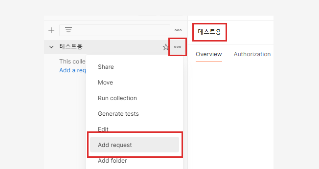 5. collection 이름변경 -> API 요청 테스트는 Add request를 클릭
