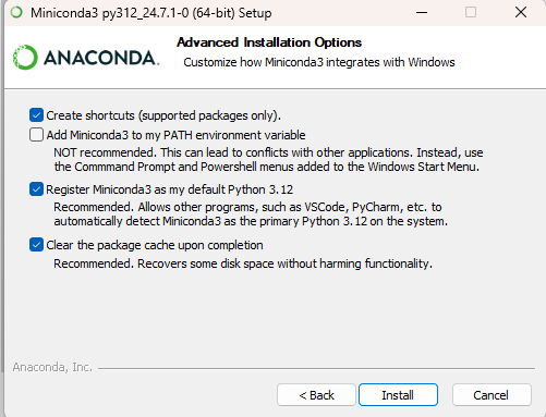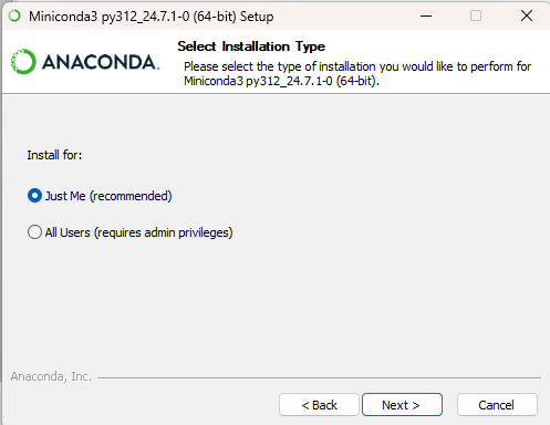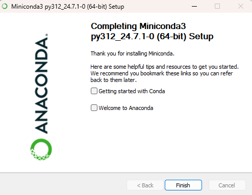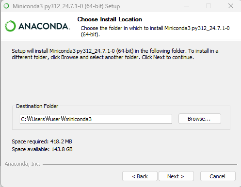 Miniconda는 Python과 Conda 패키지 관리자만 설치되어, 이후 필요한 라이브러리나 툴을 선택적으로 설치할 수 있는 형태입니다. 이는 Anaconda보다 훨씬 작은 용량과 더 빠른 설치 시간을 제공합니다.