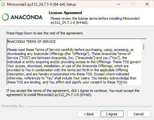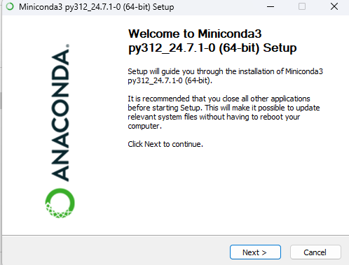 - Miniconda는 필수적인 Python 인터프리터와 Conda 패키지 관리 도구만 포함되어 있어 가벼운 설치가 가능합니다. 이후 사용자는 필요한 라이브러리나 툴을 Conda 명령을 통해 개별적으로 설치하게 됩니다.