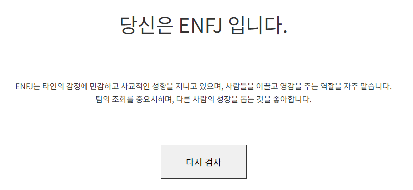 - 설명: ENFJ는 타인을 돕고 영감을 주는 것을 즐깁니다. 사교적이고 친절하며, 다른 사람을 이끄는 리더십을 발휘하는 성향이 강합니다.