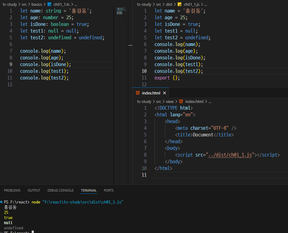 ✔ view/index.html → HTML을 활용한 TypeScript 실행 테스트 (웹 브라우저에서 실행 가능)