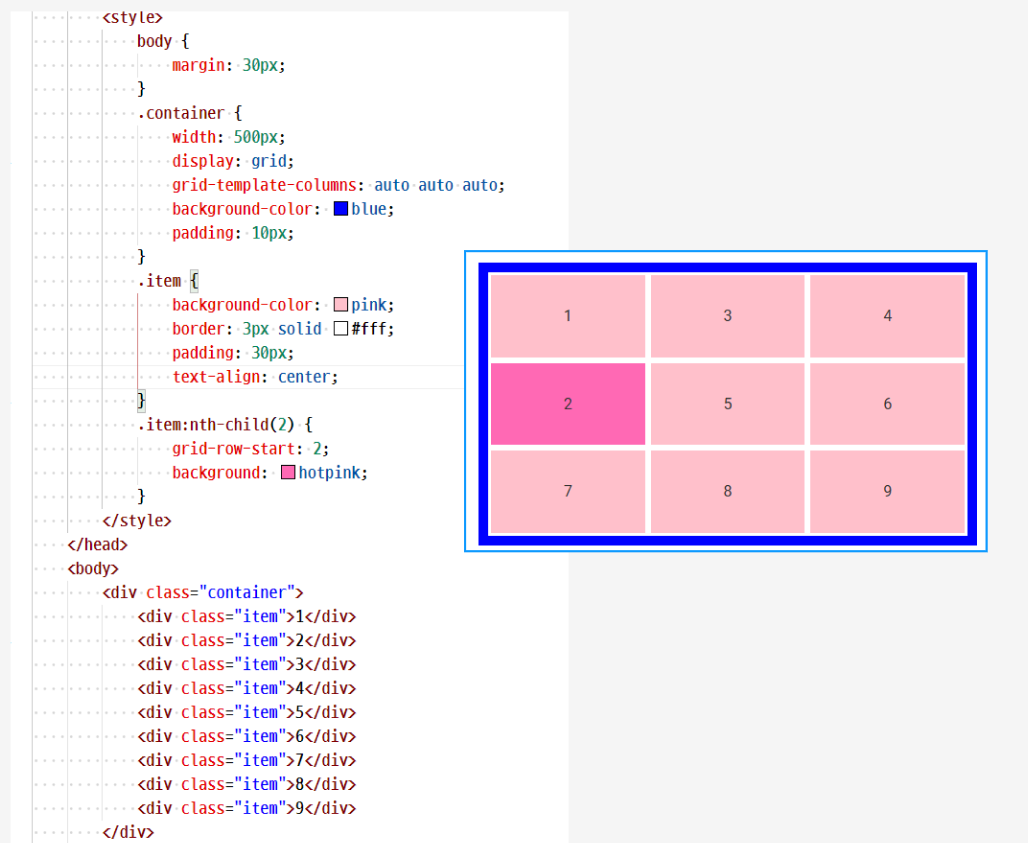 | grid-row-start | 아이템이 시작할 행 번호를 지정. |