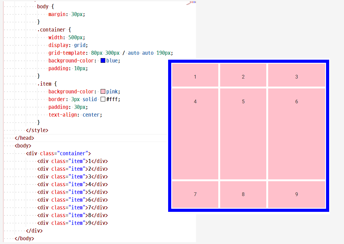 - <track-size>: 각 행의 크기를 지정합니다. px, %, fr, auto, minmax()와 같은 값들을 사용할 수 있습니다.