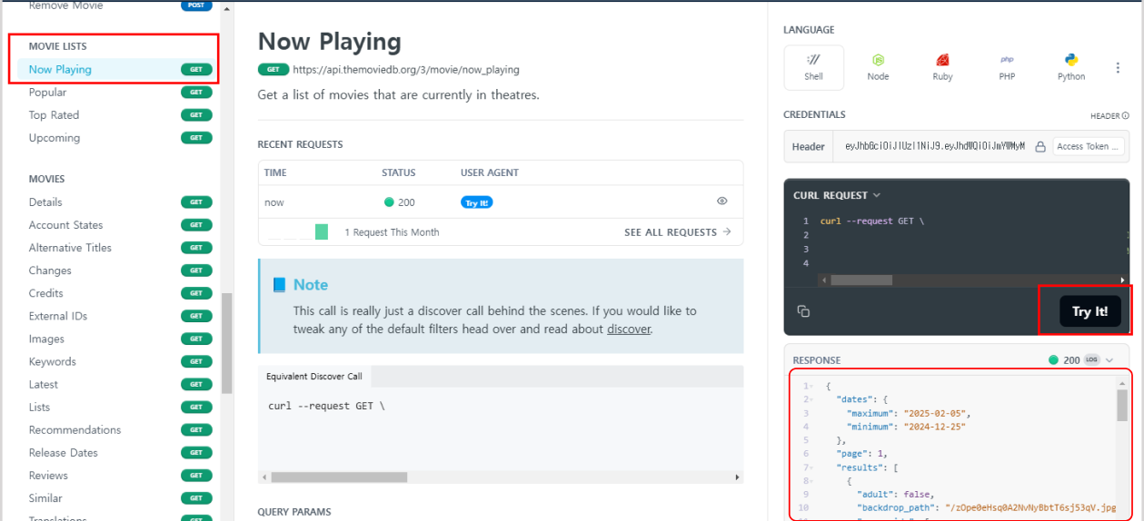 예) discover 엔드포인트로 현재 상영 중이면서 액션 장르인 영화만 직접 요청.