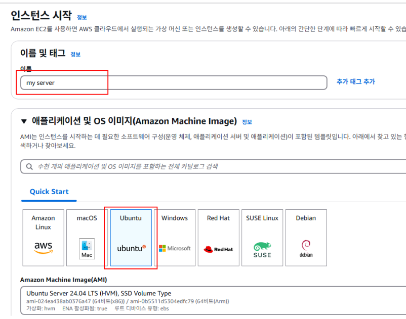 - Amazon Linux 2 AMI 또는 Ubuntu Server를 선택합니다.