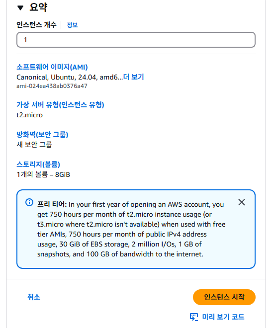 - 인스턴스 유형 선택 (t2.micro가 프리 티어로 이용 가능).