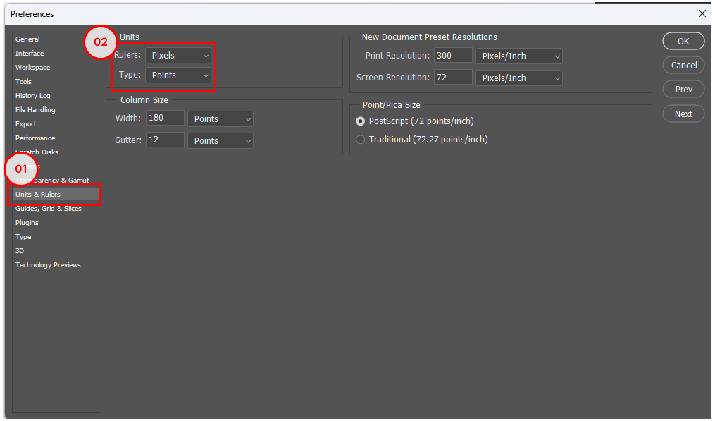 [Units & Rulers]를 선택하고 Rulers(눈금자)는 [Pixels], Type(글자 크기)는 [Points]