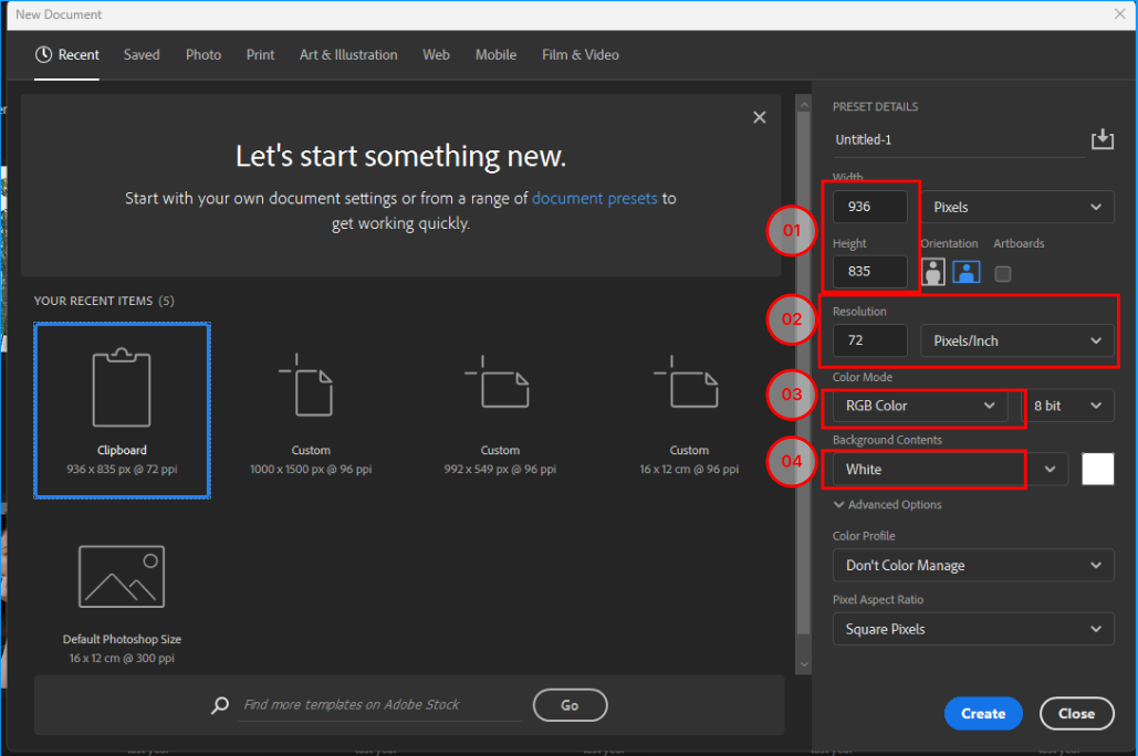 01 = Width / Height (가로 / 세로, 문서 크기) - 단위는 Pixels(픽셀) 사용