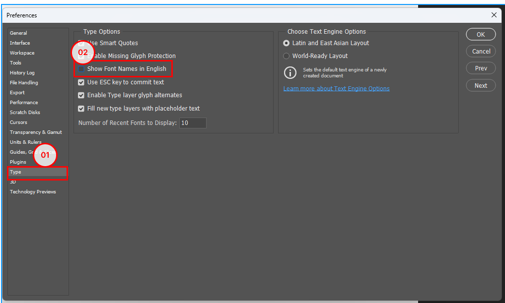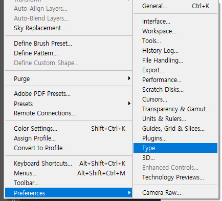 글꼴 한글로 보이도록 [Type]에서 [Show Font Names in English](글꼴 이름을 영어로 표시)를 체크 해제