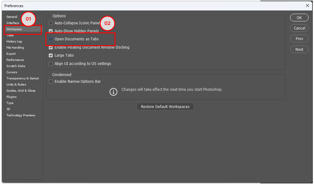 [Workspace] 에서 [Open Documents as Taps](탭으로 문서 열기)를 체크 해제