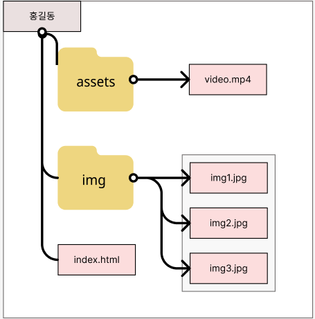 홍길동 폴더안에 자식 assets, img , index.html -> 형제