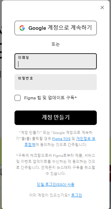 - 이메일 주소 및 고유한 비밀번호를 사용해 Figma에 가입하세요.