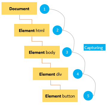 캡처링은 이벤트가 최상위 요소에서 시작하여 하위 요소로 이동하는 단계입니다. 이벤트가 트리의 루트에서 시작하여 이벤트 대상 요소까지 이동합니다.