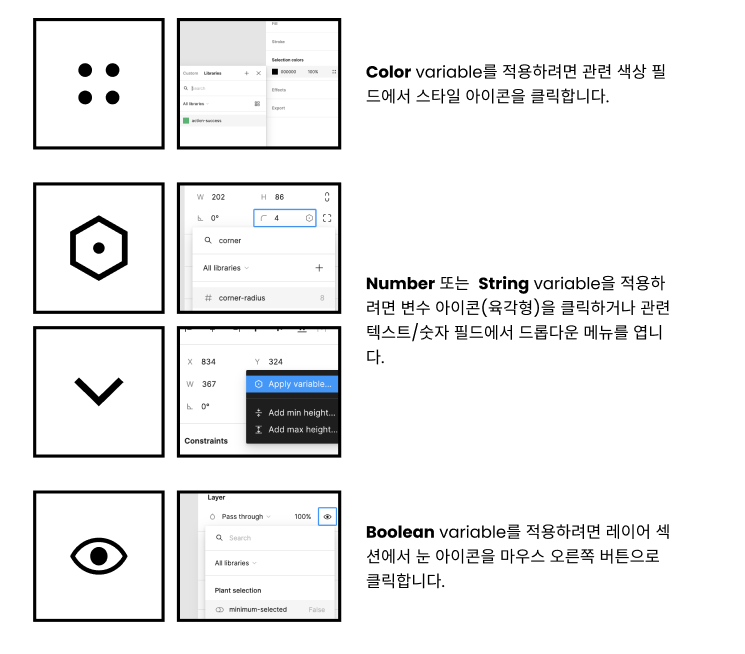 - 분류: 색상 변수를 용도에 따라 분류(예: 텍스트, 배경, 버튼 등)하면 관리하기 더 쉽습니다.
