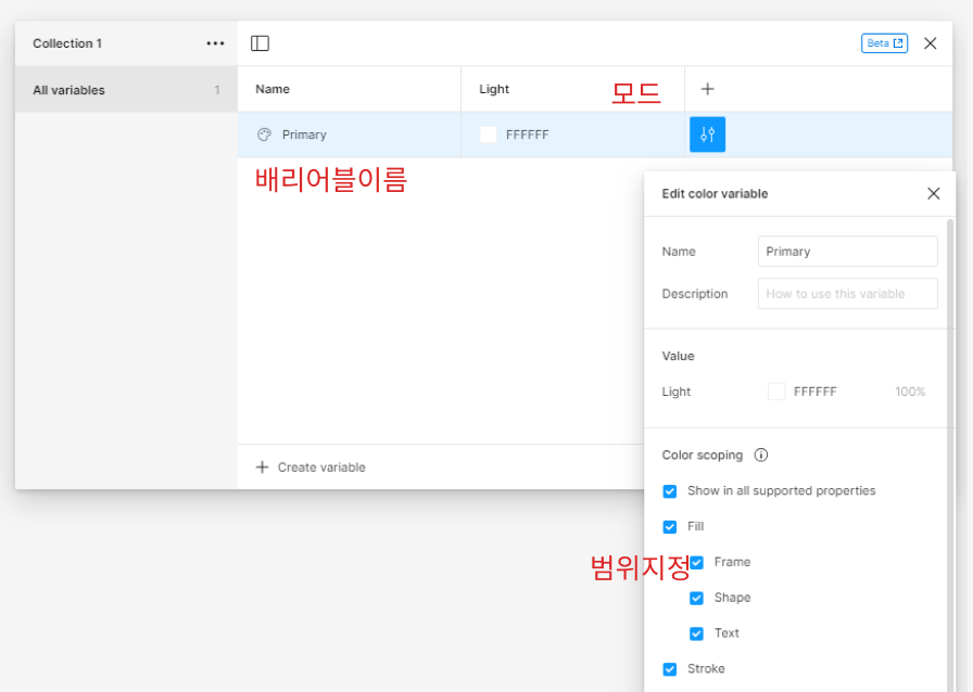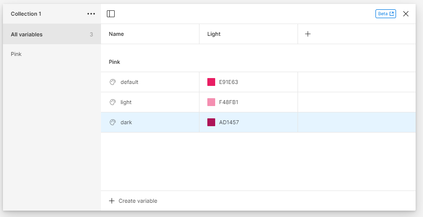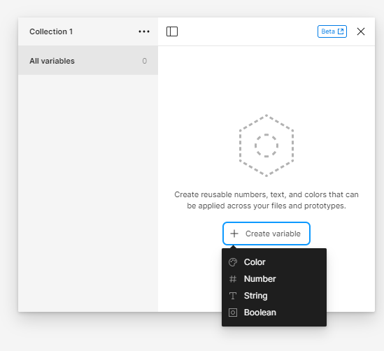 - 'Variables' 패널에서 '+' 아이콘을 클릭하여 새 변수 컬렉션을 만듭니다. 이 컬렉션은 색상 변수를 그룹화하는 데 사용됩니다.