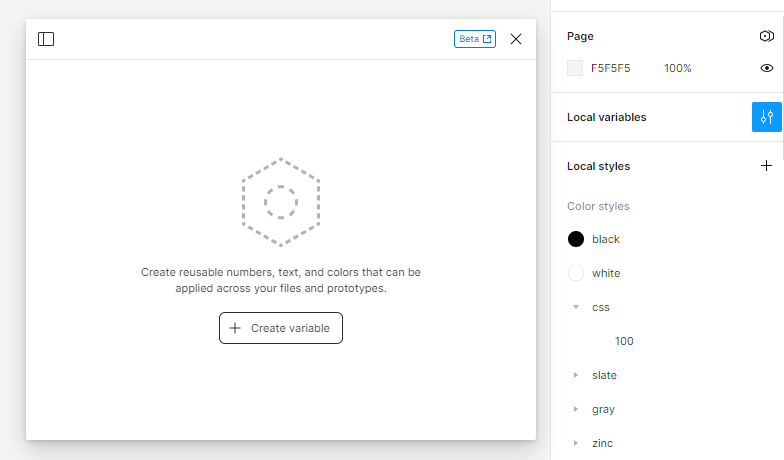 - 상단 메뉴에서 'Variables' 버튼을 클릭하거나, 오른쪽 패널의 'Design' 탭 아래에 있는 'Variables' 섹션으로 이동합니다.