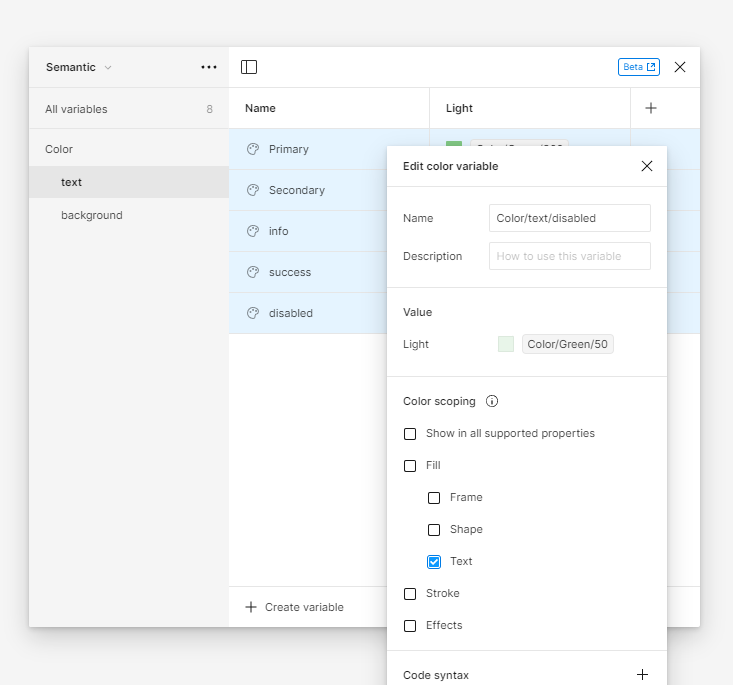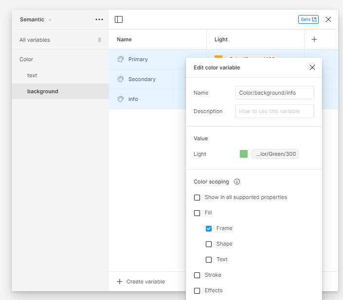 - 설명: 시맨틱(Semantic)은 라이트 모드와 다크 모드와 같은 다양한 UI 환경에 적합한 색상을 담은 컬렉션입니다. 시맨틱 색상은 기능적 의미에 따라 정의되며, 사용자의 경험을 개선하기 위해 특정 상황에서 색상을 어떻게 사용할지 정의합니다. 이 컬렉션은 UI의 상태나 역할에 따라 색상을 정의하는데 사용됩니다.