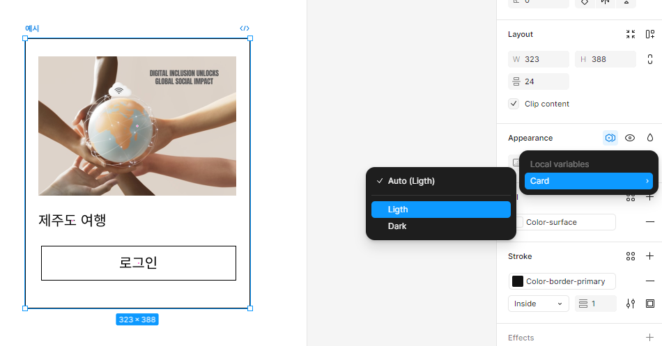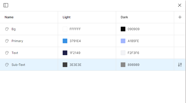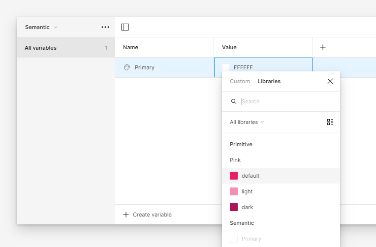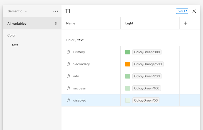 - 시맨틱(Semantic): 라이트/다크 모드와 같은 다양한 환경에서 사용될 수 있는 시맨틱 색상을 담은 컬렉션으로, 기능적 의미에 따라 색상 사용을 정의. UI 요소에 일관된 시각적 경험을 제공.