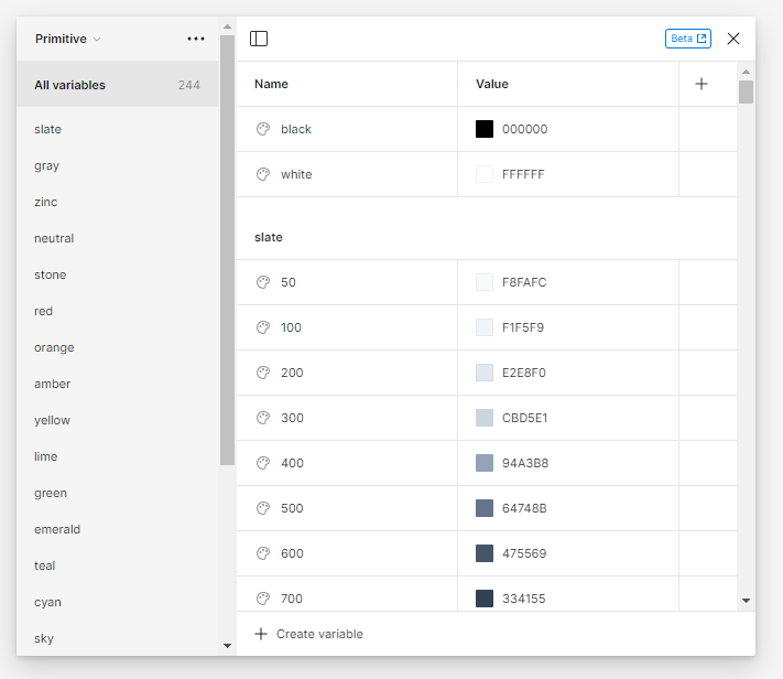 - 설명: 기본(Primitive)은 디자인 언어의 기본값을 나타내는 컬렉션입니다. 이 컬렉션은 다양한 색상들의 원시값(Raw value)을 포함하며, 디자인 시스템에서 색상을 사용하는 가장 기초적인 레벨입니다. 여기에는 색상 자체의 정보가 담겨 있으며, 브랜드나 테마 같은 시맨틱한 의미가 적용되기 전의 상태입니다.