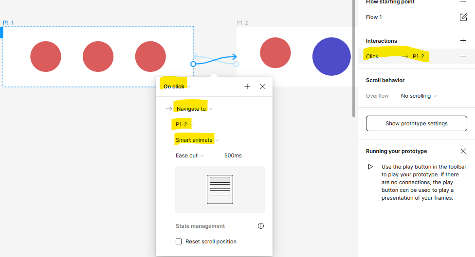 - 첫 번째 도형 핫스팟 선택 첫 번째 프레임선택 연결할 프레임 선택 - On click - Smart animate 시간 지정하기 1초 1000ms