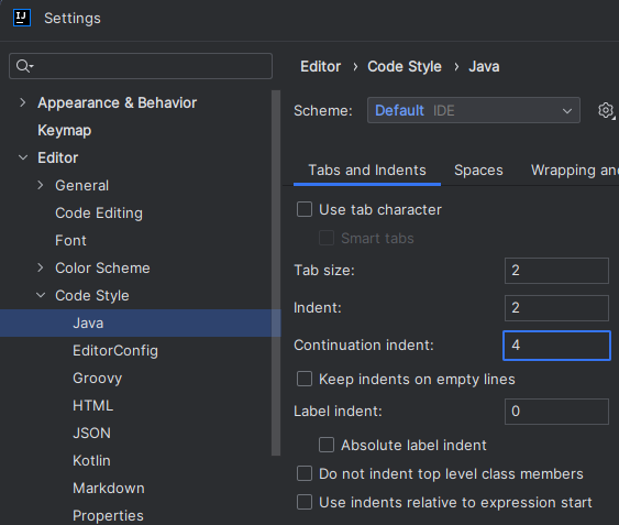 Settings > Editor > Code Style > Java > Tabs and Indents