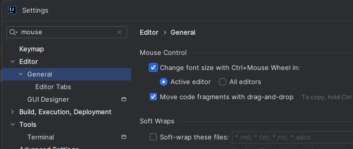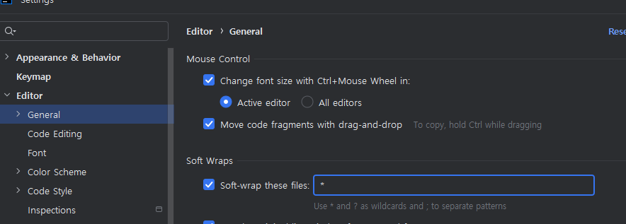 General > Change font size with Ctrl+Mouse Wheel in 체크