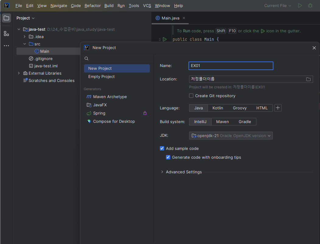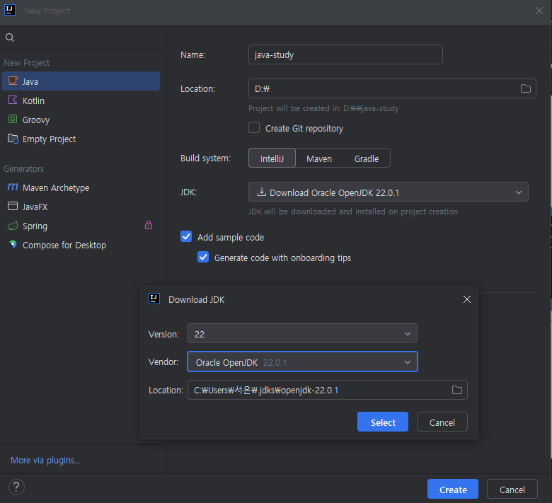 인텔리제이 안에서 자바 설치도 함께 진행합니다.
