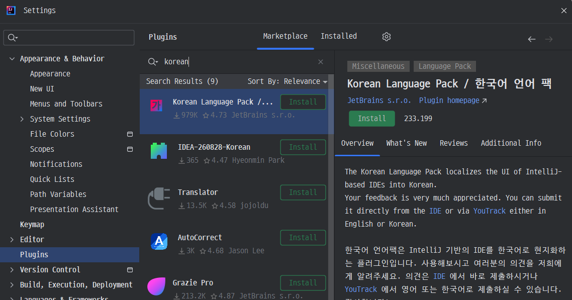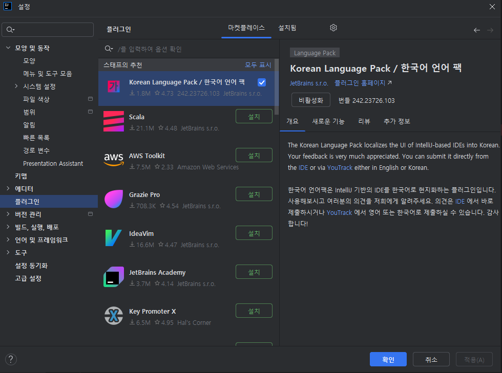 Settings > Plugins > Installed 부분 korean 검색 후 제거