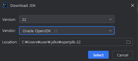JDK : Download JDK - 최신버전 22 - Oracle Open JDK 22.0.1 , Location 은 그대로 두고 다운로드