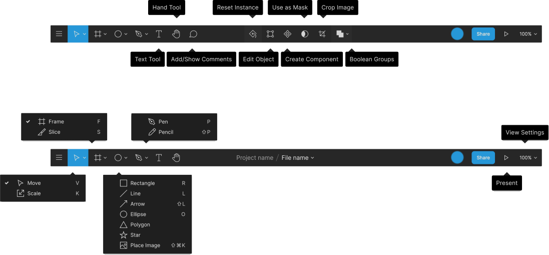 - 프레임 프리셋 : 아이폰, 안드로이드, 데스크톱 사이즈 등을 지정합니다. 프레임을 제어하는 기능 외에는 레이어와 동일하게 사용 가능합니다. , Frame , Group , Seciton 가능