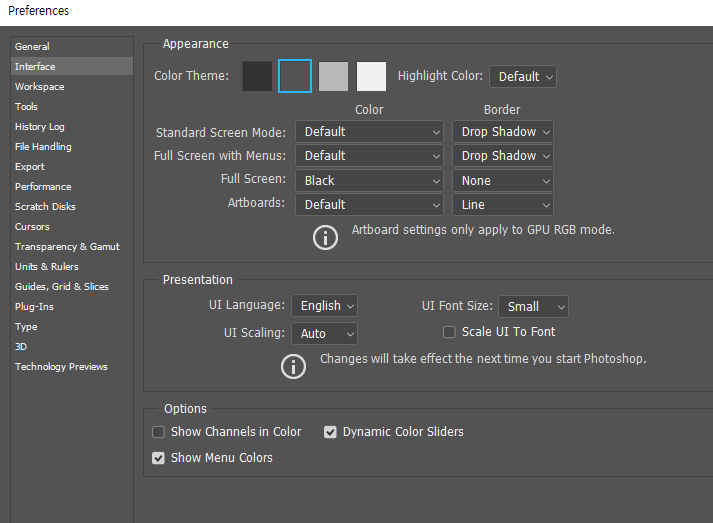 [Edit]-[Preferences]-[Interface] 메뉴 선택 -> [Preferences]-[Appearance]에서 인터페이스 색상 변경