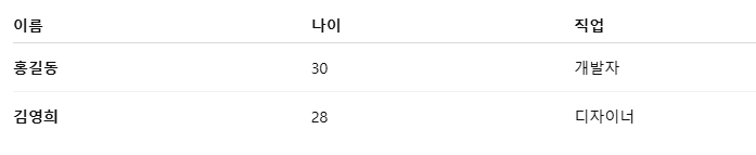 - 열 제목(th): scope="col" → 이름, 나이, 직업