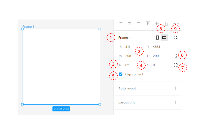 - 위치와 사이즈 : 모든 프레임과 레이어에는 위치값(x , y)과 사이즈 (width, height)가 있습니다.